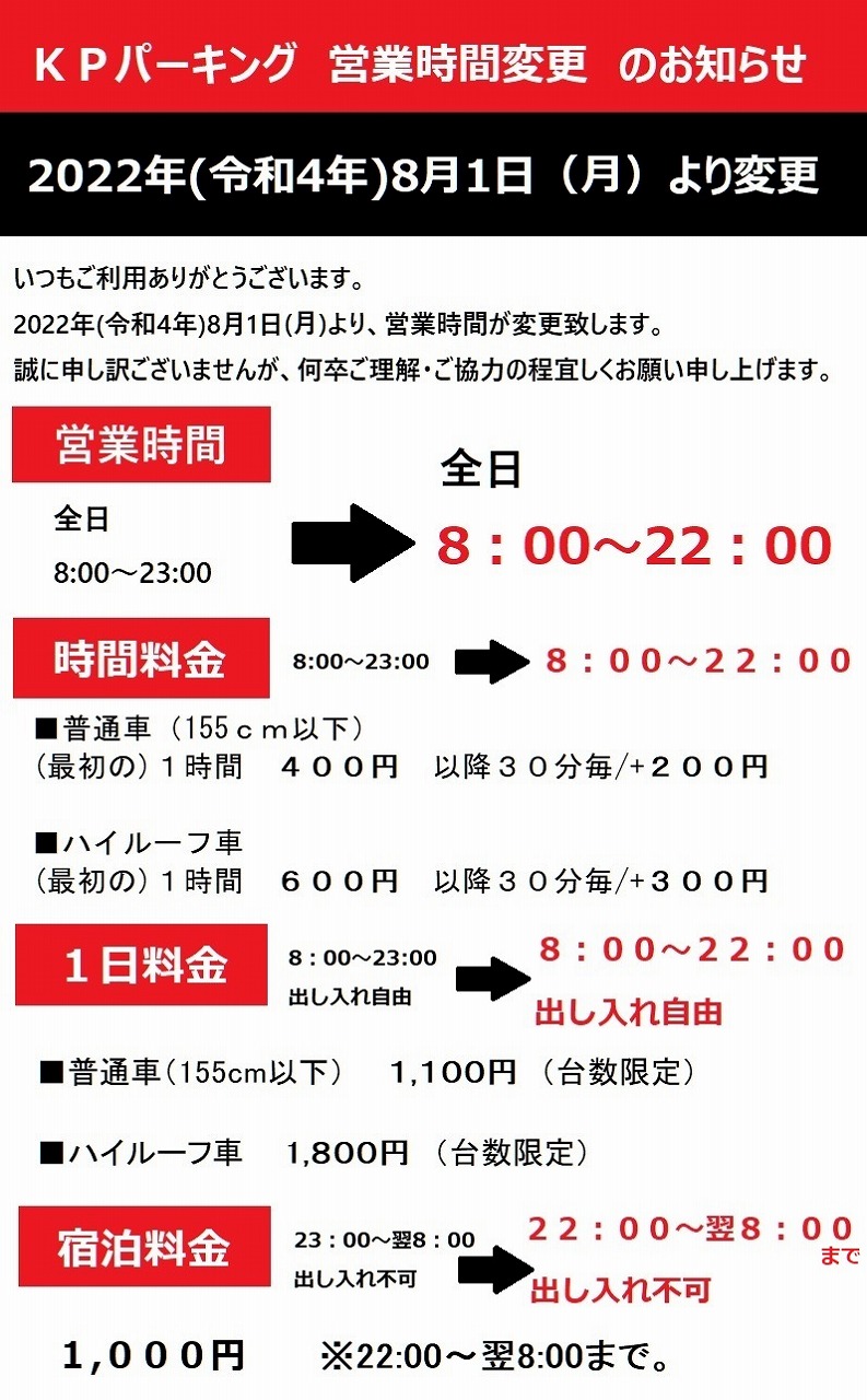 2022年8月1日(月)より、カナリヤ本店裏にある「KPパーキング」の営業時間が変更になりました。