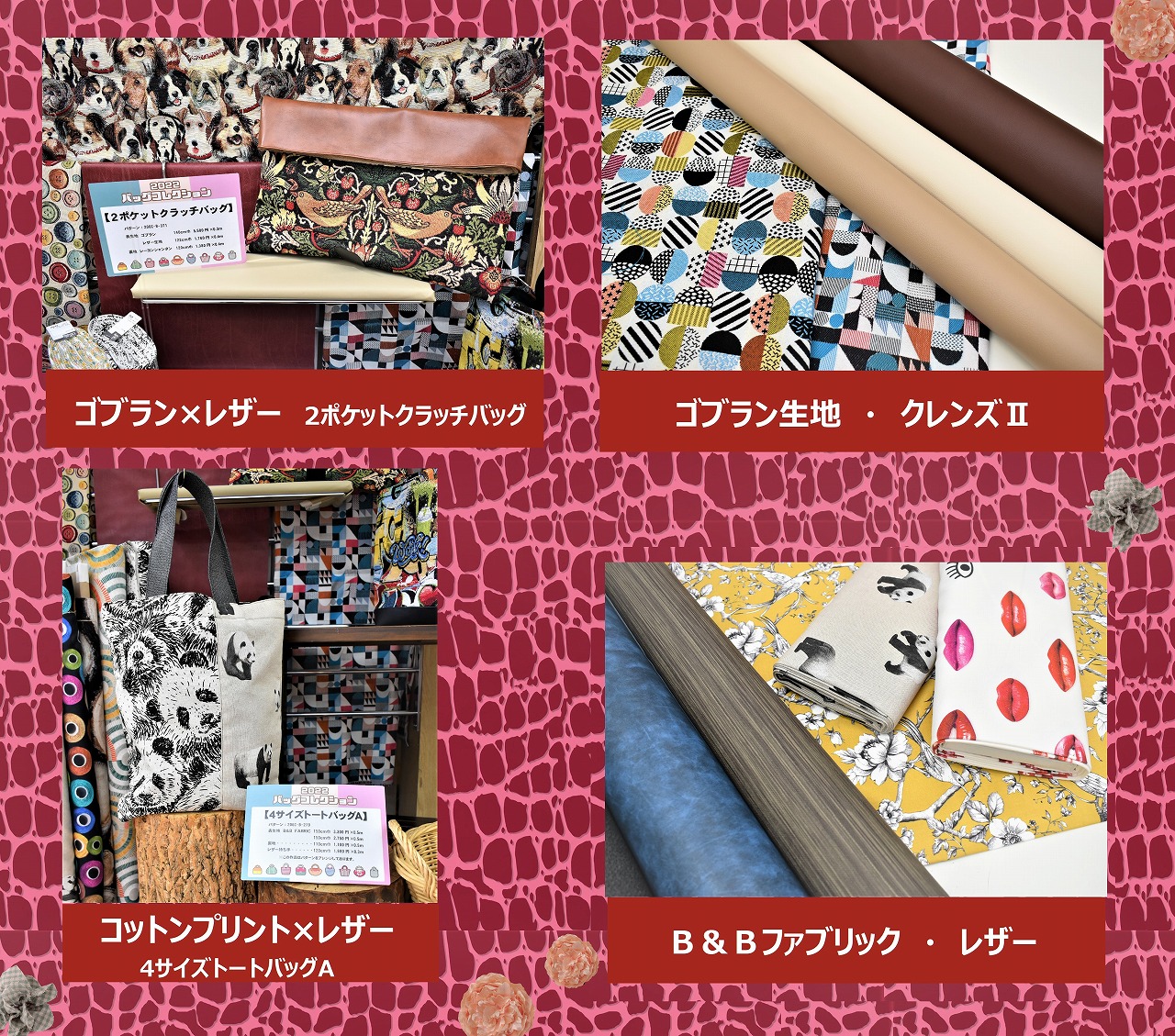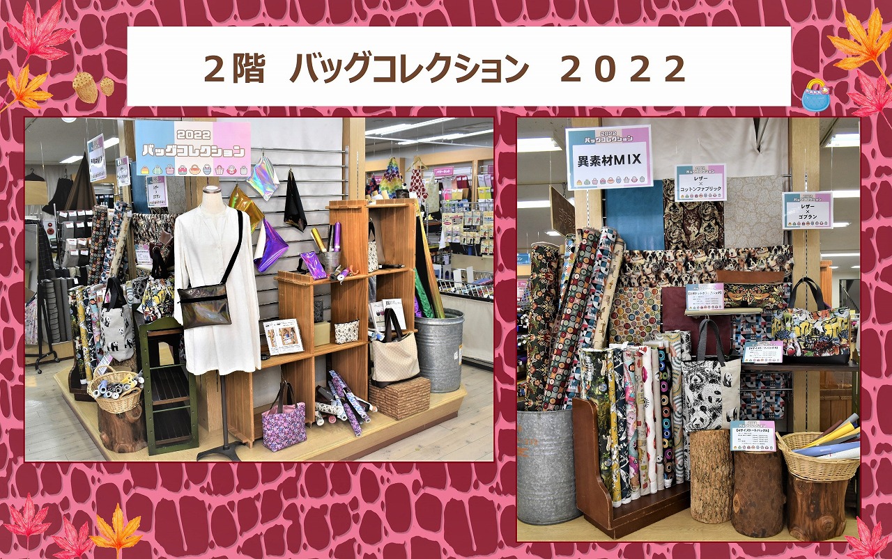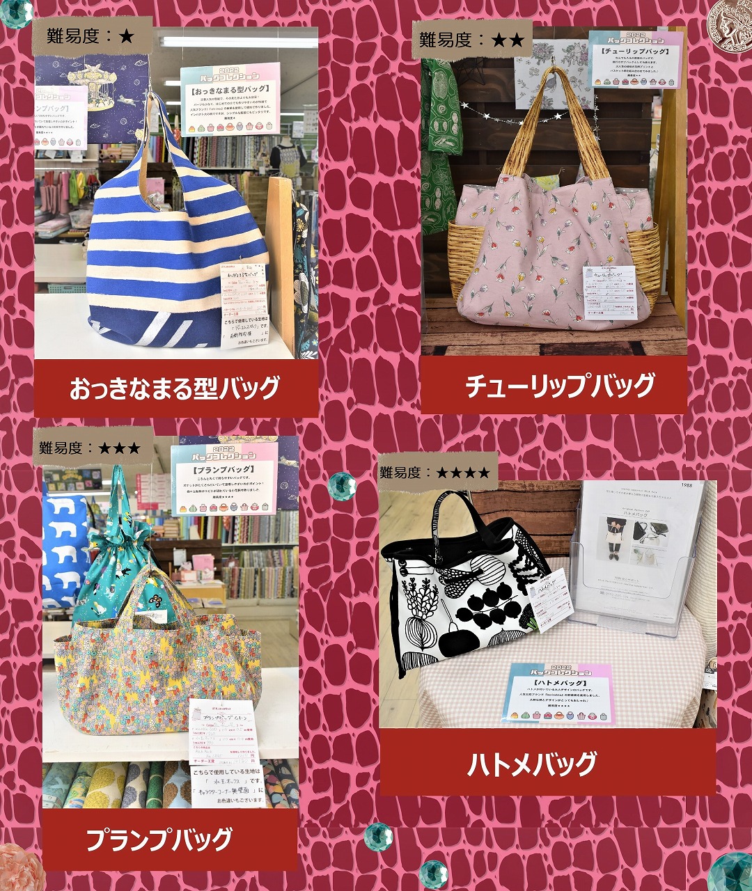 人気のバッグの形や秋の新柄で作ったバッグを展開しました。自分好みの形や、柄で楽しむバッグを手づくりしてみませんか??