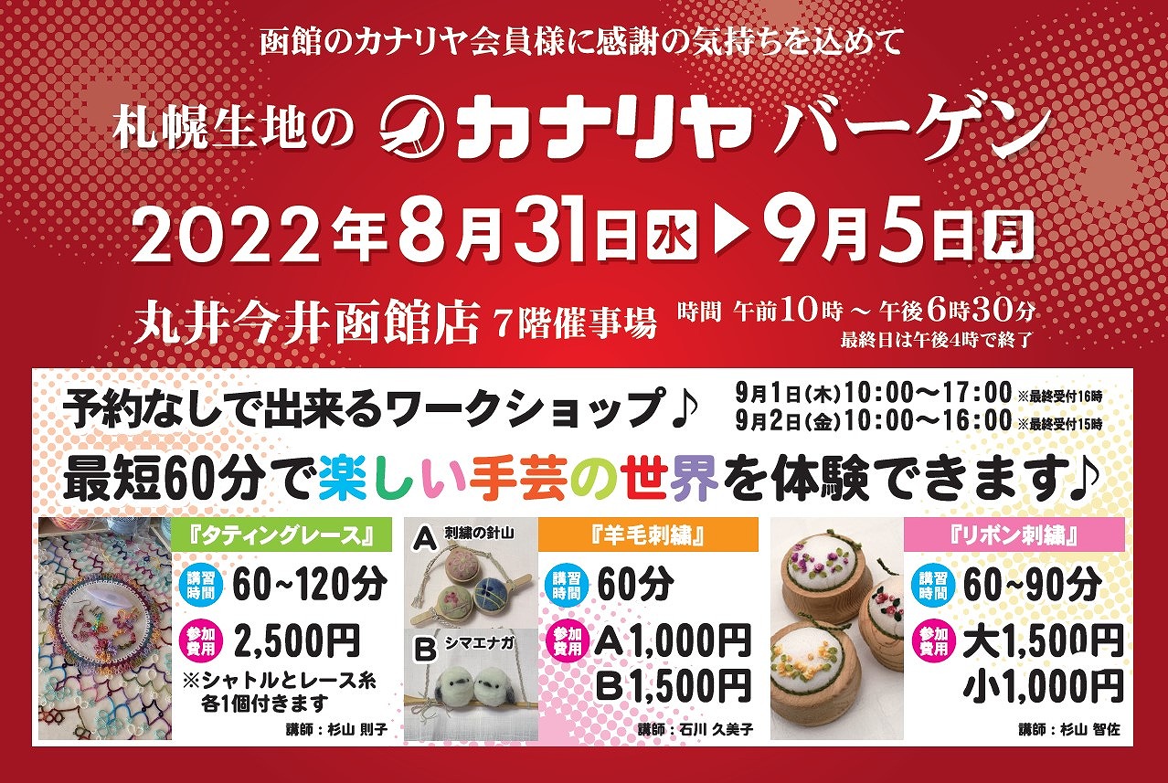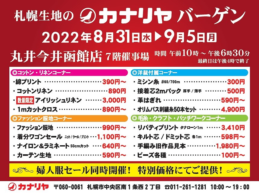 2022年8月31日(水)~9月5日(月)までの期間、丸井今井函館店7階催事場にて、札幌生地のカナリヤバーゲンを開催致します。