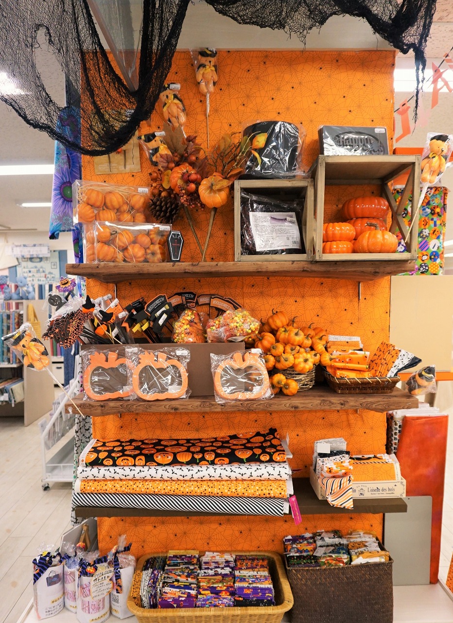 カナリヤ本店4階ではハロウィン生地やかぼちゃ、クマさんのピック、リボン等ハロウィンにちなんだアイテム等が豊富です!