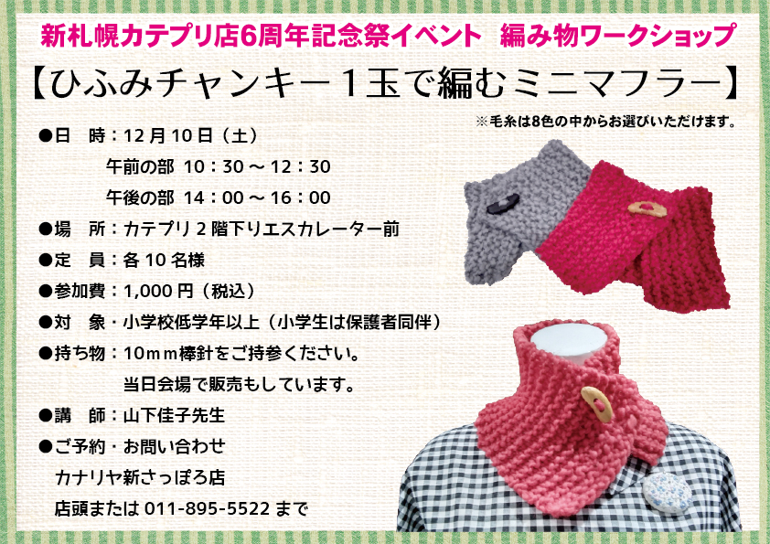 新札幌カテプリ店6周年記念祭イベント!新さっぽろ店では2022年12月10日(土)にて、編み物ワークショップを開催致します。