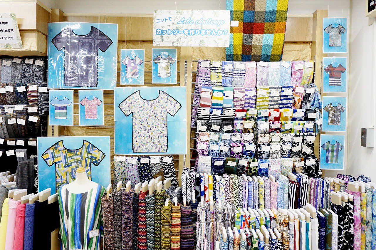 カナリヤ本店2階より、パネルがとてもカラフル♪夏らしく涼しげな「ニットでTシャツ作りませんか?コーナー」が展開中です!!