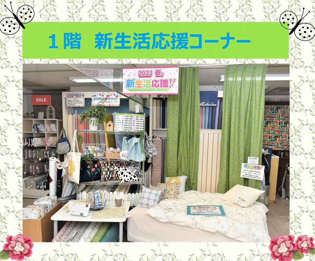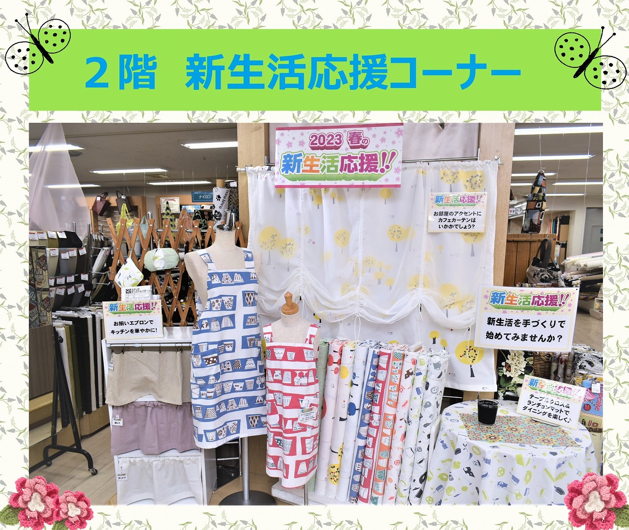 2階ではこれからの春の新生活に向けて、お買い得なオーダーセールのご案内や手作り出来る新生活に必要なインテリア小物の提案をしています。