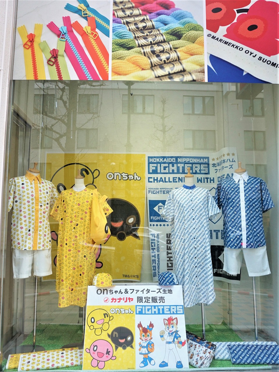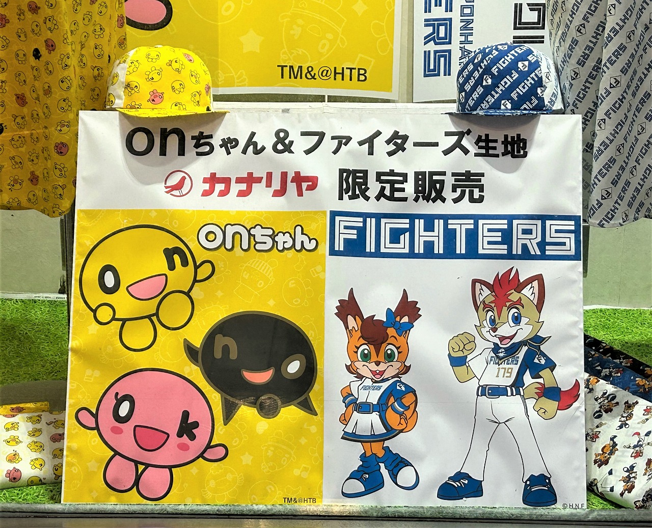北口側にはカナリヤ本店・各支店で2023年1月から発売中の「onちゃんプリントファイターズプリント」を使用した見本衣装やバッグ、キャップを展示致しております。