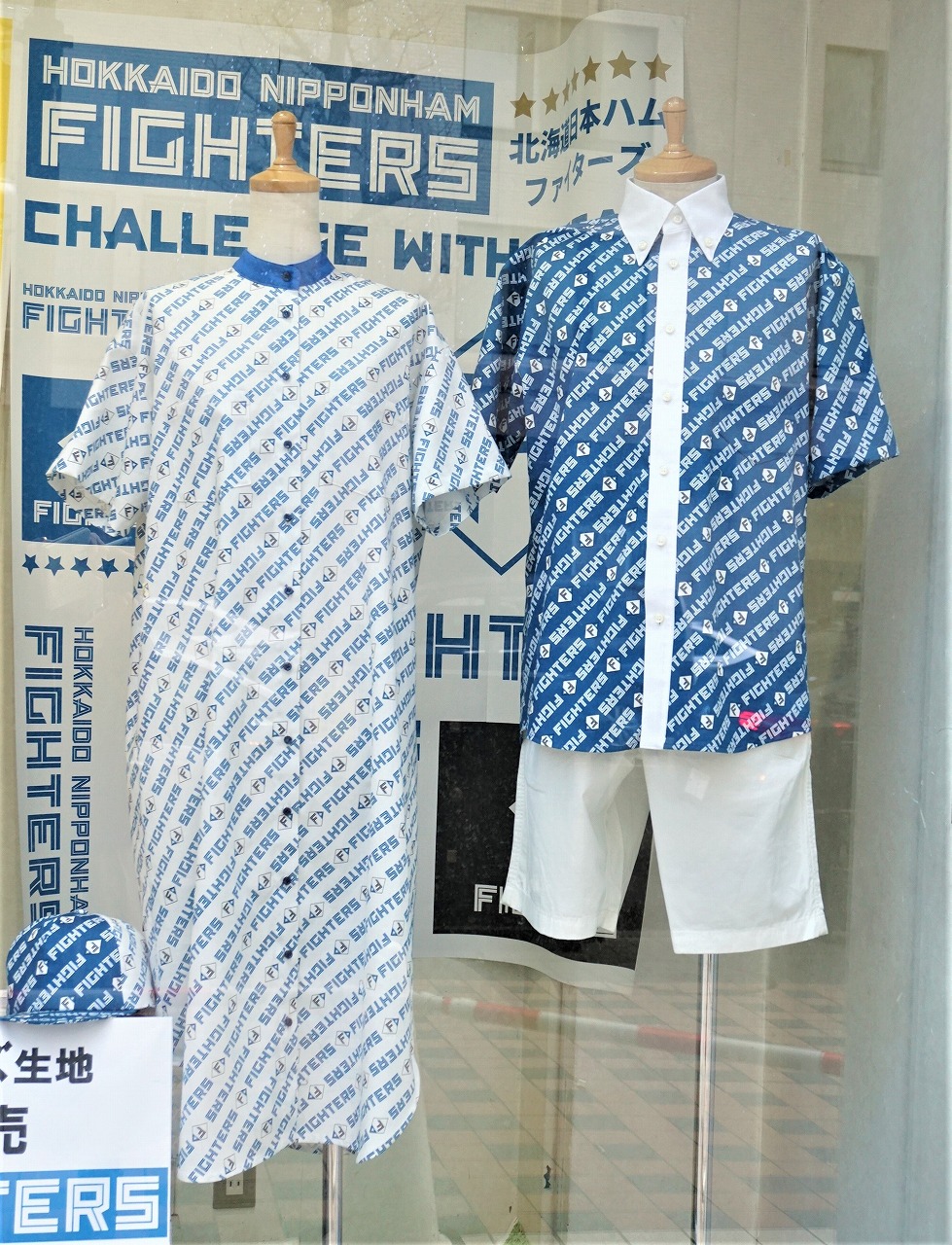 ファイターズ・ロゴ柄を使用したオリジナルYシャツとオリジナルワンピース見本です。型はonちゃんと同じにはなりますが、柄が変わるだけで印象が違いますね(^v^)一気に爽やかな印象になりました。