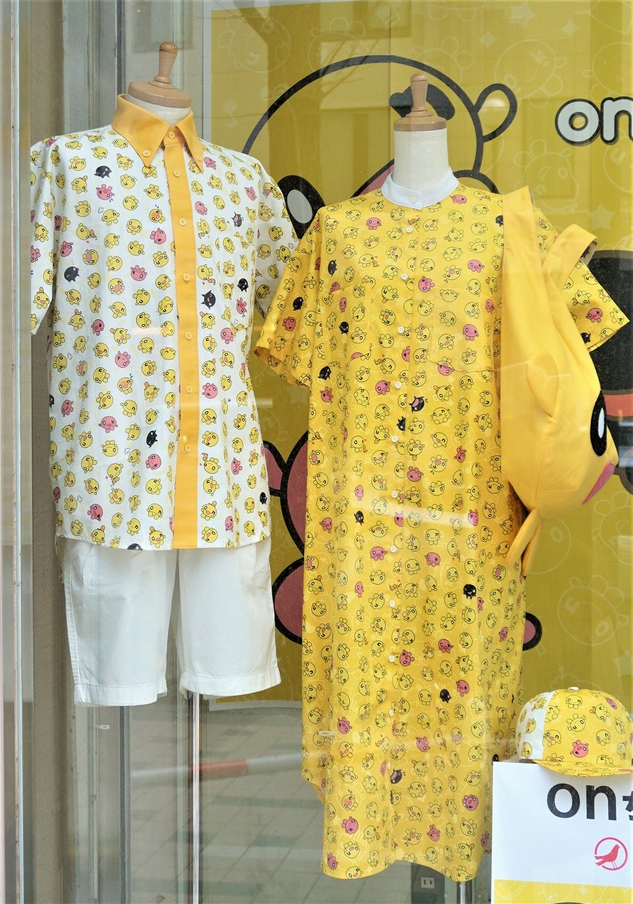 onちゃん柄の半袖Yシャツ、半袖バンドカラーワンピースの服見本になります!春夏らしく使いやすい型であり、onちゃんプリントを使用する事により、オリジナルファッションに早変わり♪