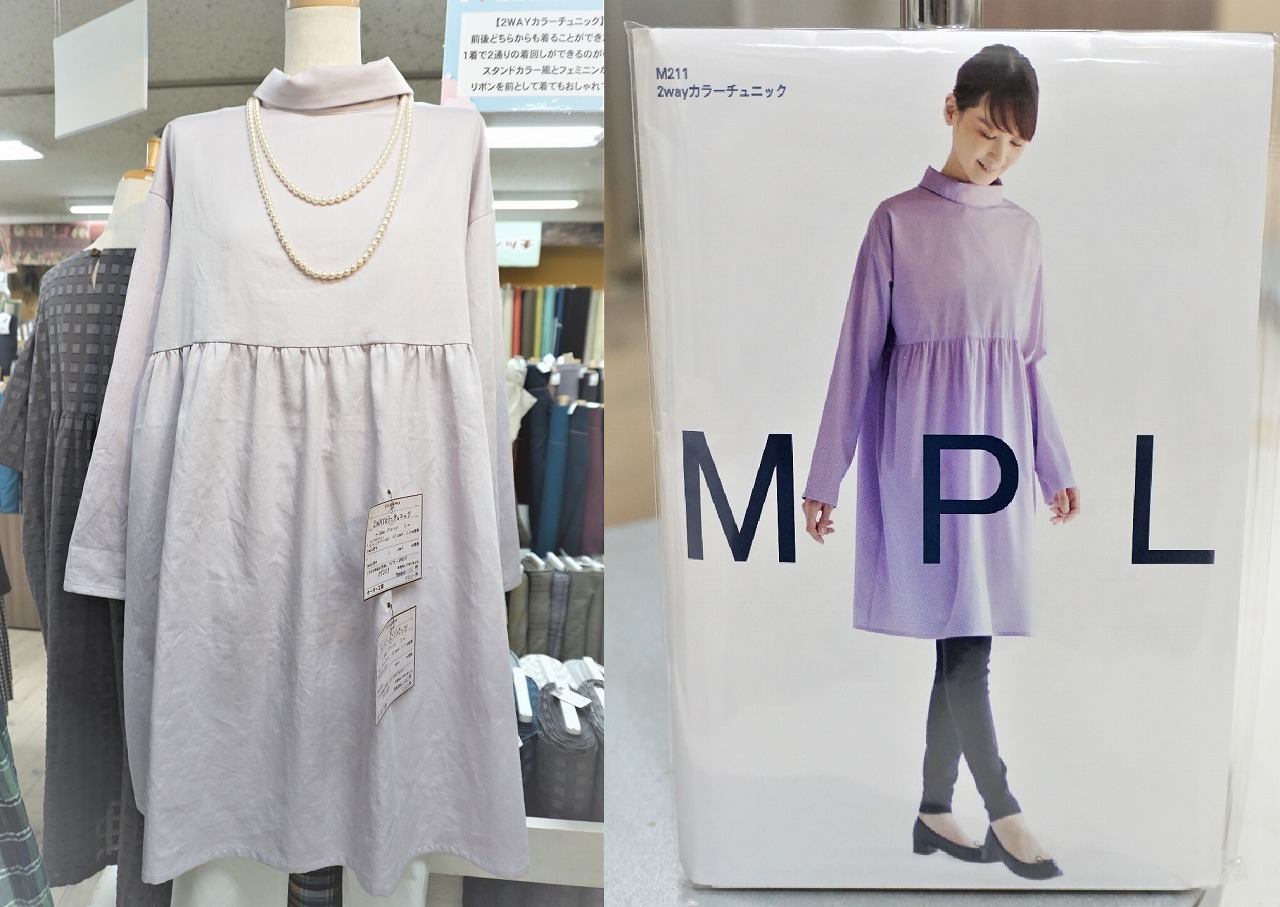 ラベンダーカラーが綺麗な春に使えるチュニック見本です。前後どちらも着用できるデザインで、首元はロールカラー、フラットカラー、タートルネックにすることができます。1着作れば様々な着こなしができるおすすめチュニックです。