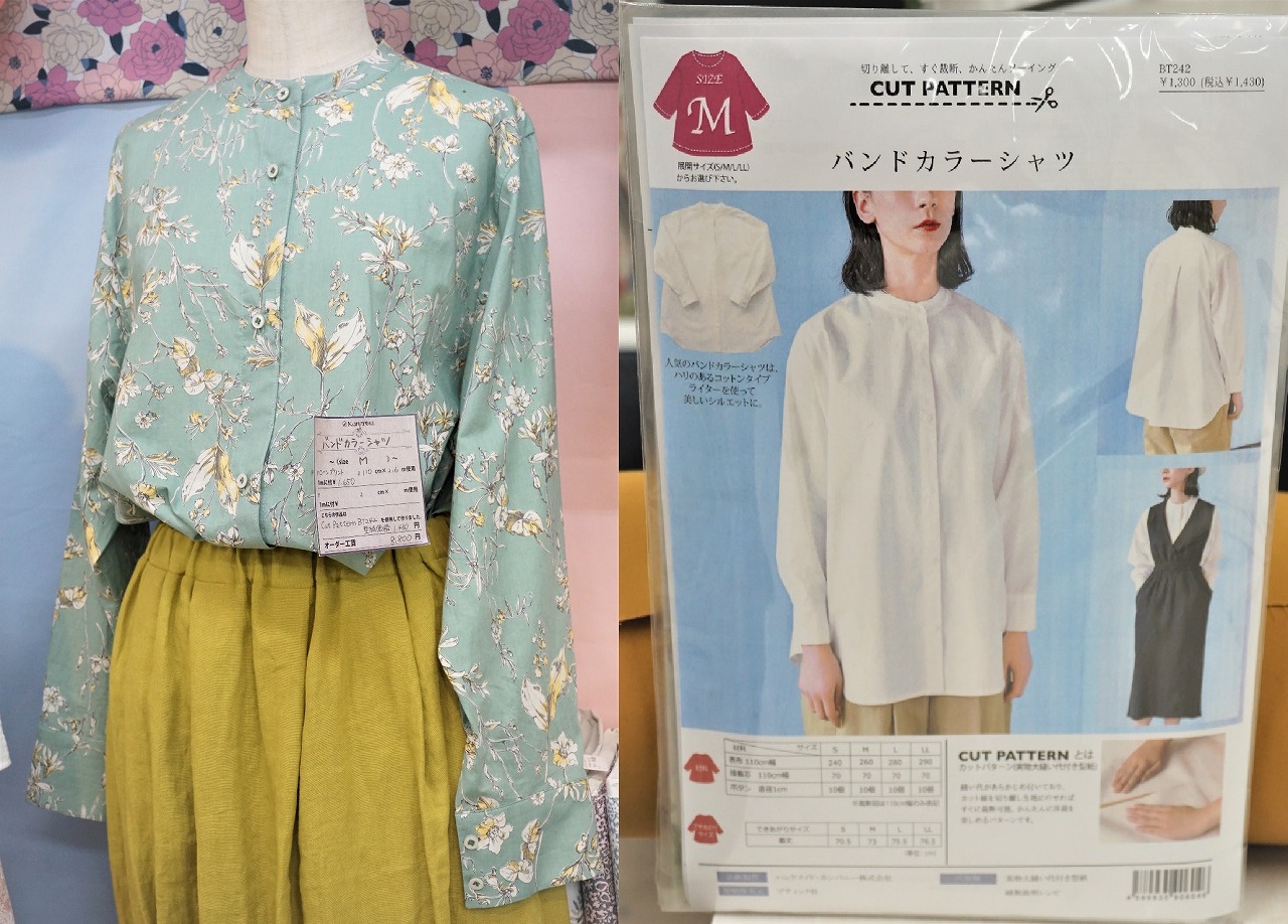 明るいミントグリーン地に花柄が印象的なバンドカラーブラウスの見本と型紙です。