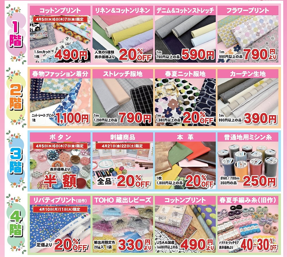 ●4/5(水)・6(木)・7(金)限定 コットンプリント・・・1.5mカット 490円