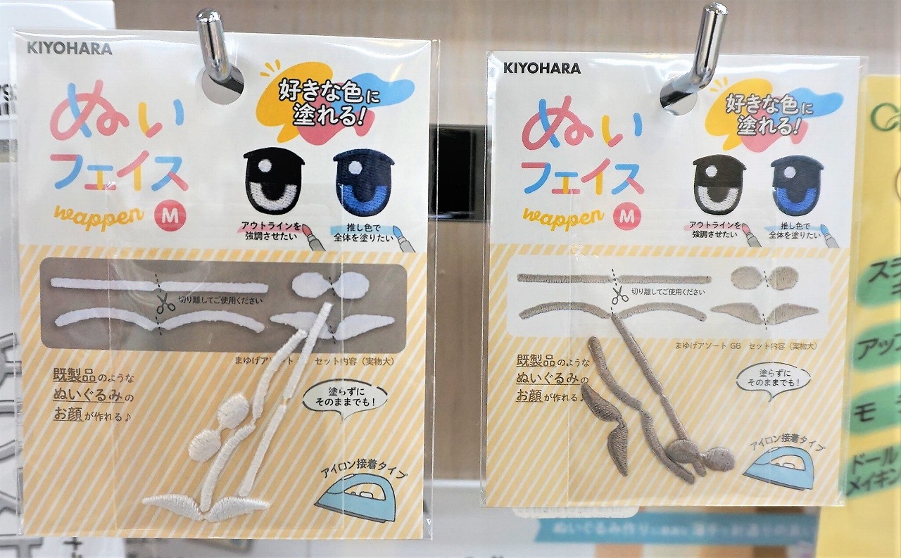 ぬいパタやぬいクロス、目のパーツなどを使った見本です。コロコロと表情が変わる女の子をイメージ見本として推しぬいコーナーにて皆様をお待ちしています
