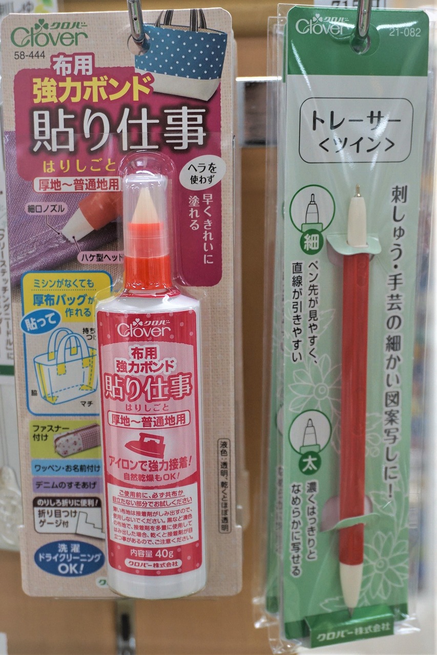 作品を仕上げる時、裏側の始末に使えるボンドと、刺しゅうのデザイン画や生地の図案写しに使えるトレーサーです。こちらはフリーステッチングだけでなく洋服やバッグ作りのサポートにも使えます!