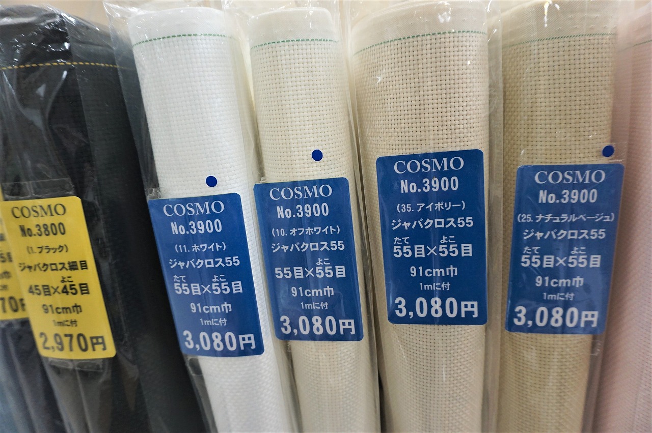 初心者の方やしっかりした作品を作りたいという方には刺繍コーナー内にある、フリーステッチ用コットンクロス生地か織のしっかりとつまっている1階のシーチングなどが適しています。刺す前に生地の裏に薄い接着芯を貼るとより刺しやすく、糸が抜けにくくなります。