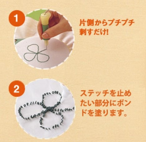生地に刺して引き上げる、を繰り返し、仕上げに裏側の糸にボンドで固定するだけでオリジナル刺しゅう作品が完成します。ブローチにしても、絵として飾っても、ハンカチの刺しゅうのワンポイントなど、ステッチ後の使い方は貴方次第!