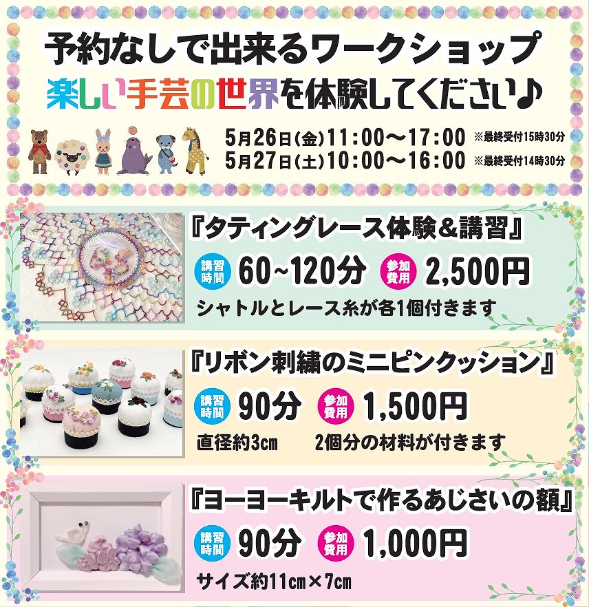 生地やアイテム、体験会など会場では手芸を楽しんで頂ける内容ばかり♪