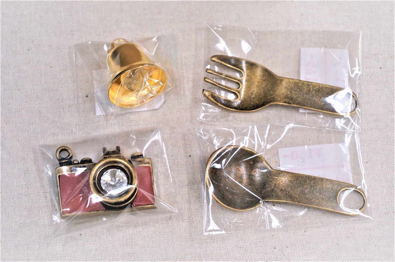 カメラやスプーン、フォーク等のチャームがアンティーク調でおしゃれ♪キルト作品のアクセント使いにおすすめです。
