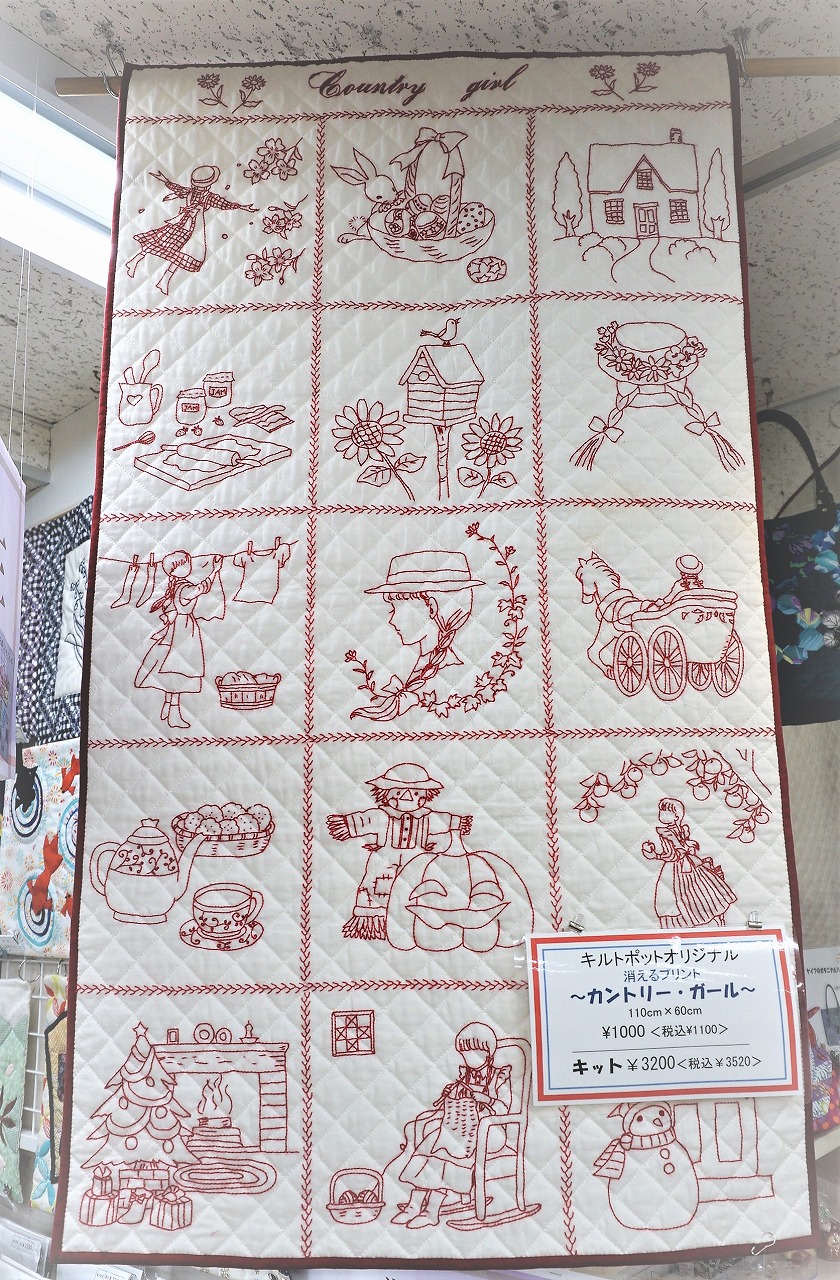 刺しゅう作品やパッチワーク作品はお花モチーフや季節事のイベント(ひな祭り、桜、七夕、お月見等)を感じさせるものが目白押し!!また、キルトポットさんオリジナルのタペストリーも赤糸×キルト地を使っていまして、日常生活を描かれている様子を表現されています。繊細さを感じて頂けるお花刺しゅうや七夕や金魚等のカラフルなパッチワークタペストリーがお部屋を彩ってくれそうですね。