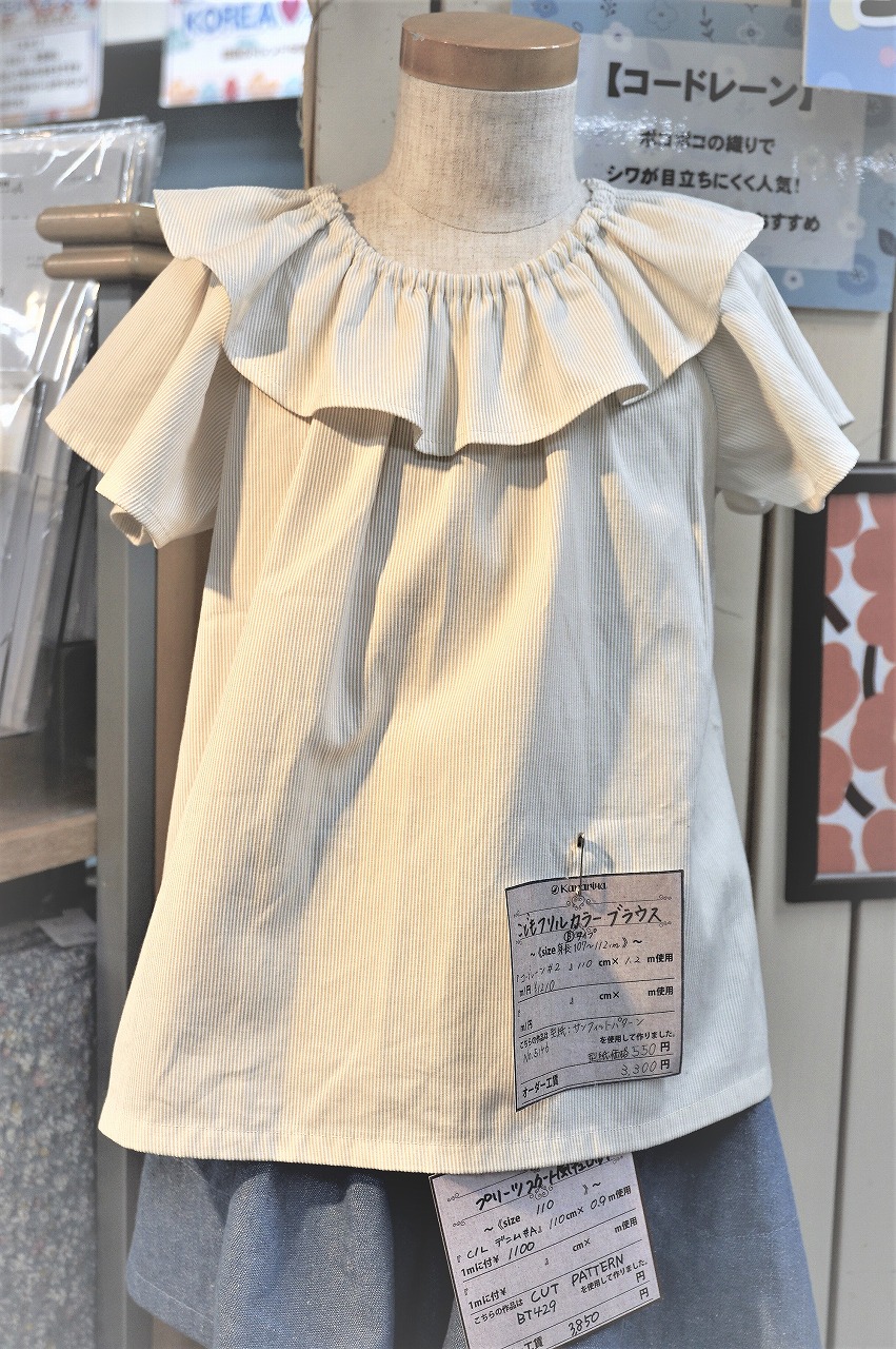 コードレーン生地を使用した子どもフリルカラーブラウス見本になります。襟元のフリルが可愛らしく、爽やかさを感じさせます。コードレーンの生地はさらっとしているので見本のようにトップス作りに最適です!