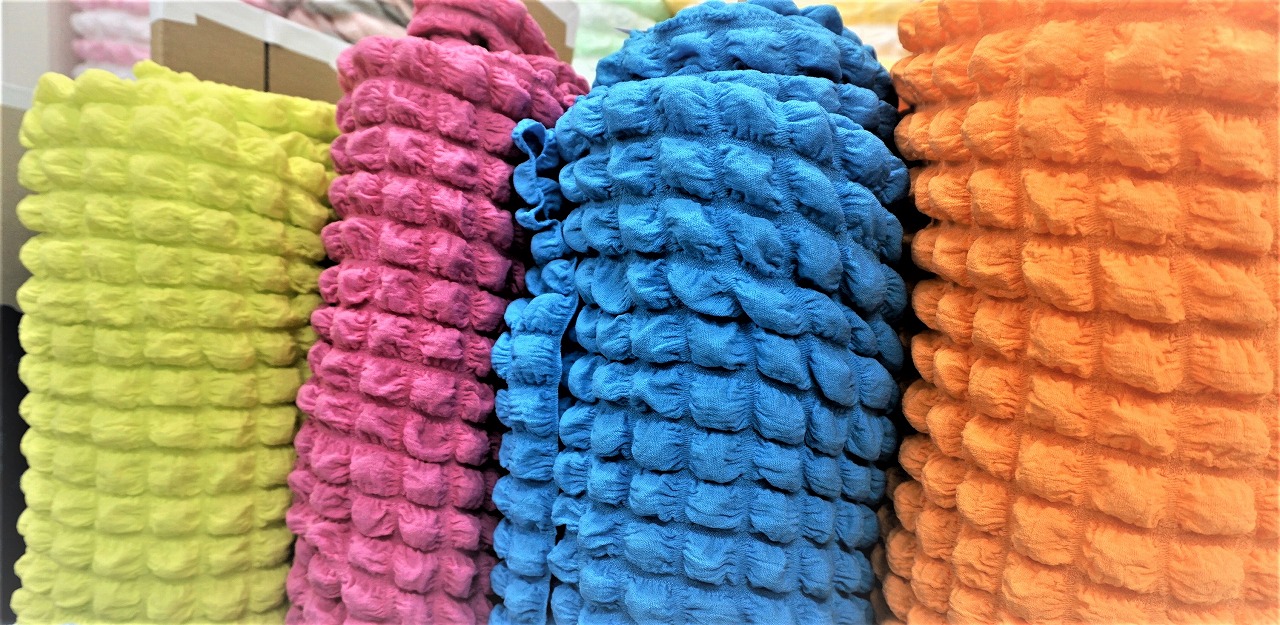 ポコポコの織りで肌への密着を防ぎます。今年は定番の無地の他、柄物も登場しております。