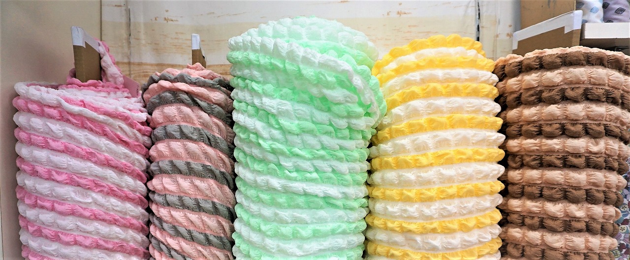 SNSや店頭でも大人気の注目生地「ポコポコポップコーン」生地に新色が登場!蛍光色と白×カラーのボーダータイプが夏らしさ満点です♪