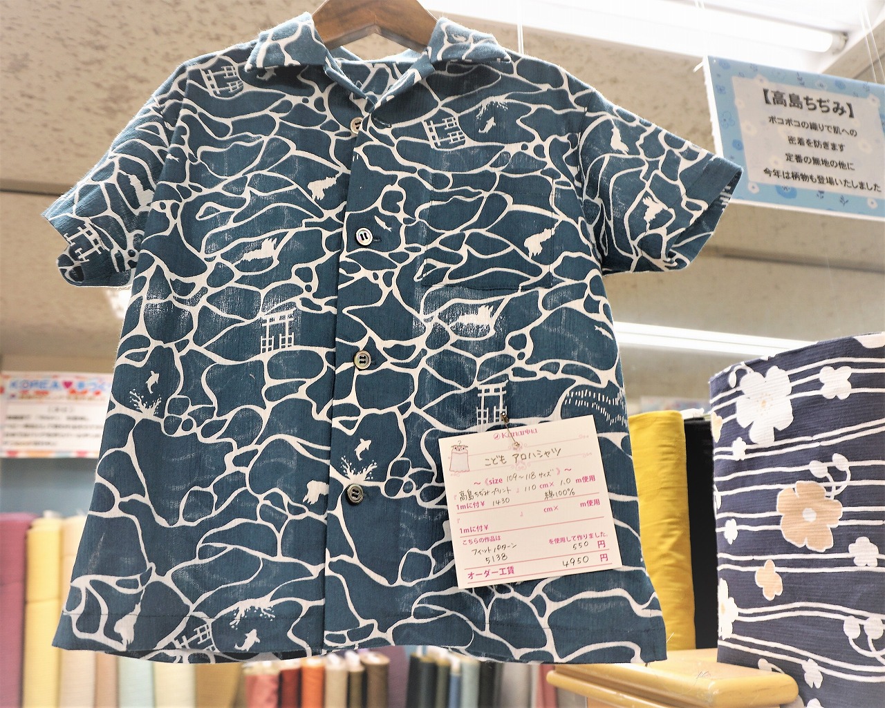 高島ちぢみの柄生地を使用したアロハシャツです。こちらの柄は「琵琶湖柄」と言われ、魚や湖、鳥居が入って和を感じられる生地です。色もありそうでなかなか見ないブルーグリーンなので見本のようにアロハシャツやリラックスパンツ等にぴったりです!