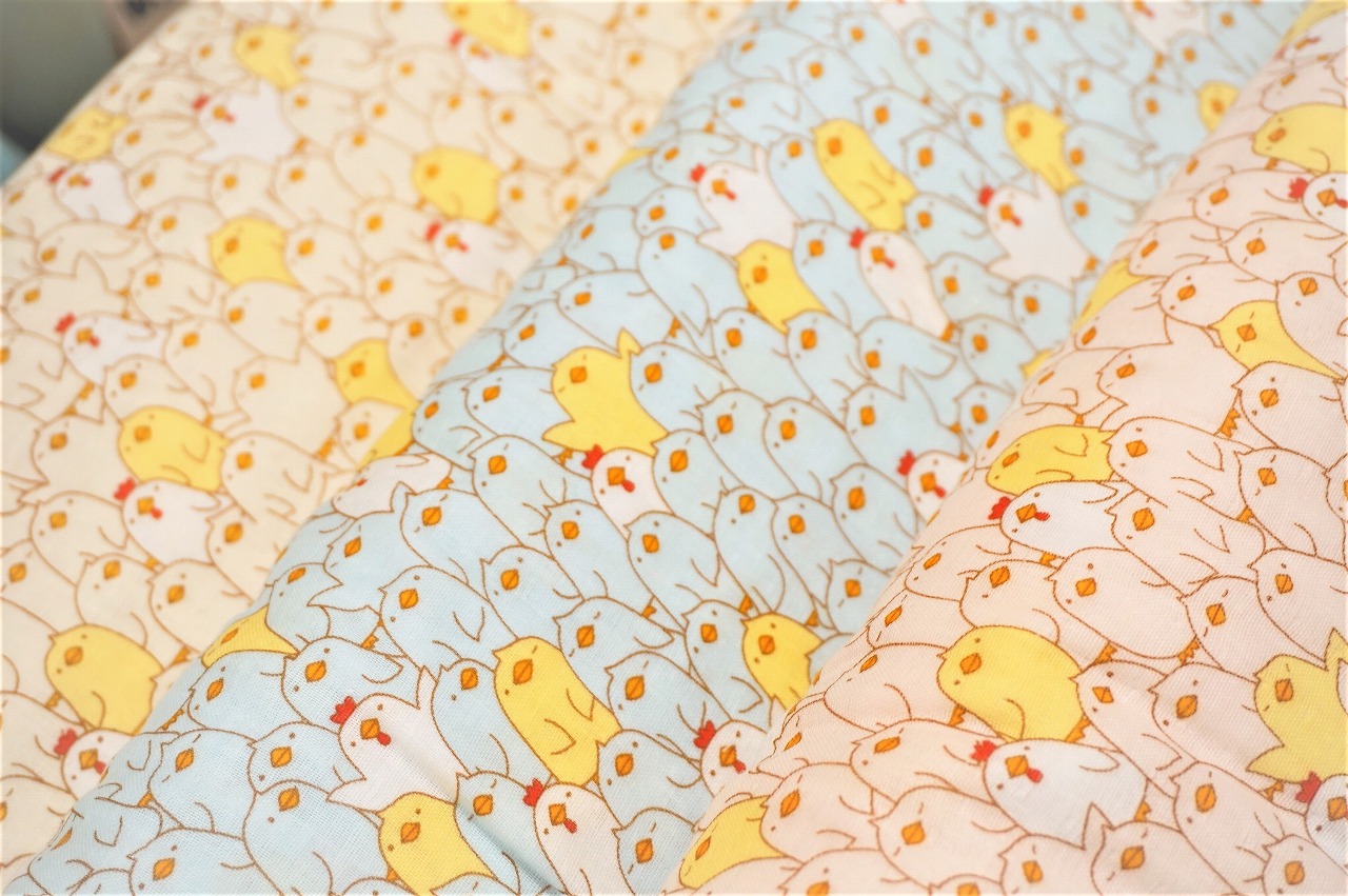 ニワトリとひよこが密集したかわいい生地です。赤ちゃんの肌着やスタイ、お子様のシャツなどにも最適です。ニワトリもひよこも動きや表情に注目です!