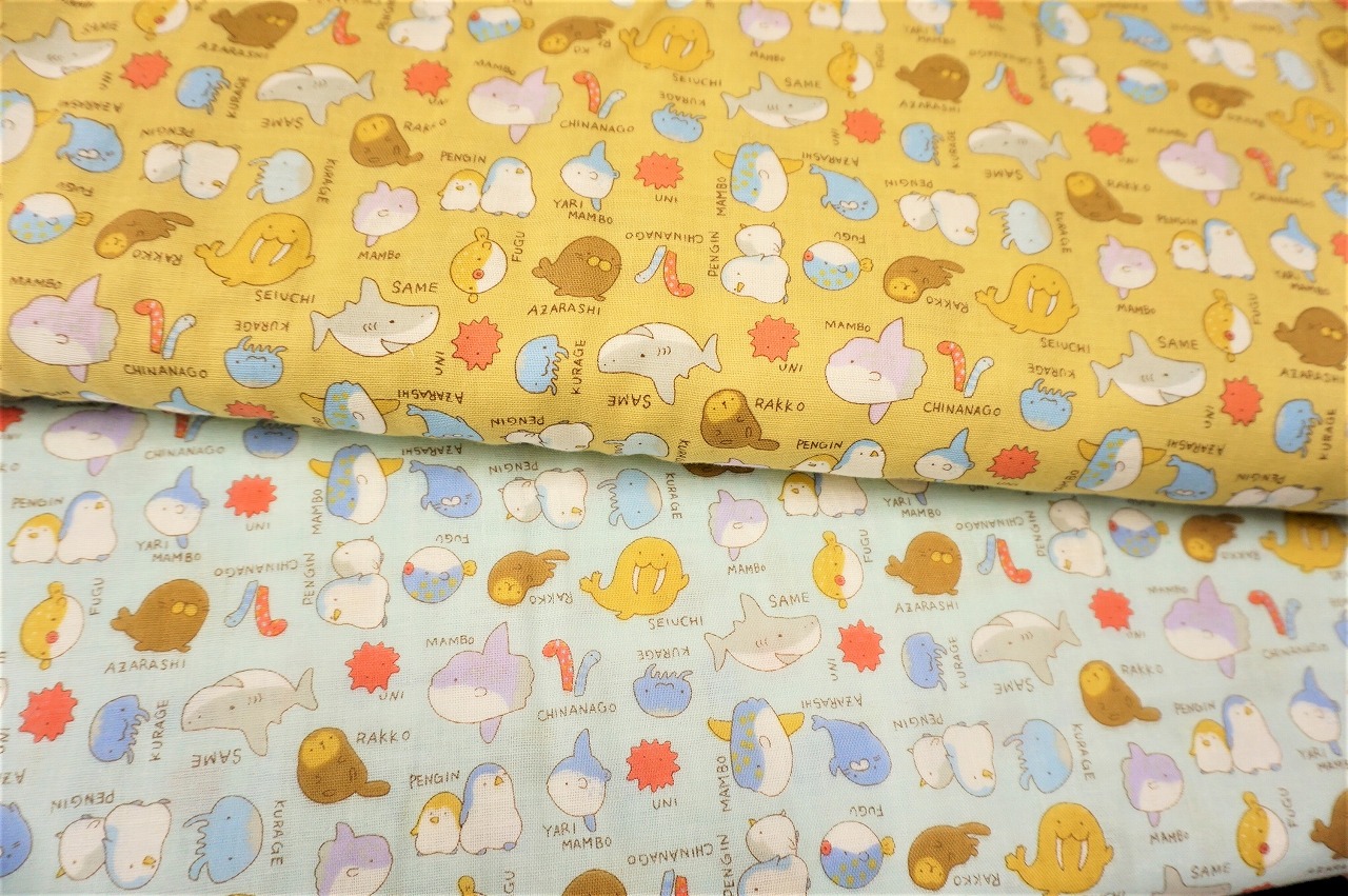マンボウやペンギン、サメなどの海の生き物が描かれた見た目も涼しい生地です。ゆるいタッチで描かれた生き物たちはみているだけで癒されます!!