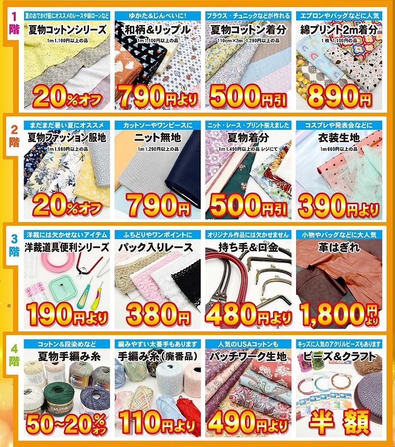 夏物商品や手作りにお役立ていただけるアイテムが豊富です。