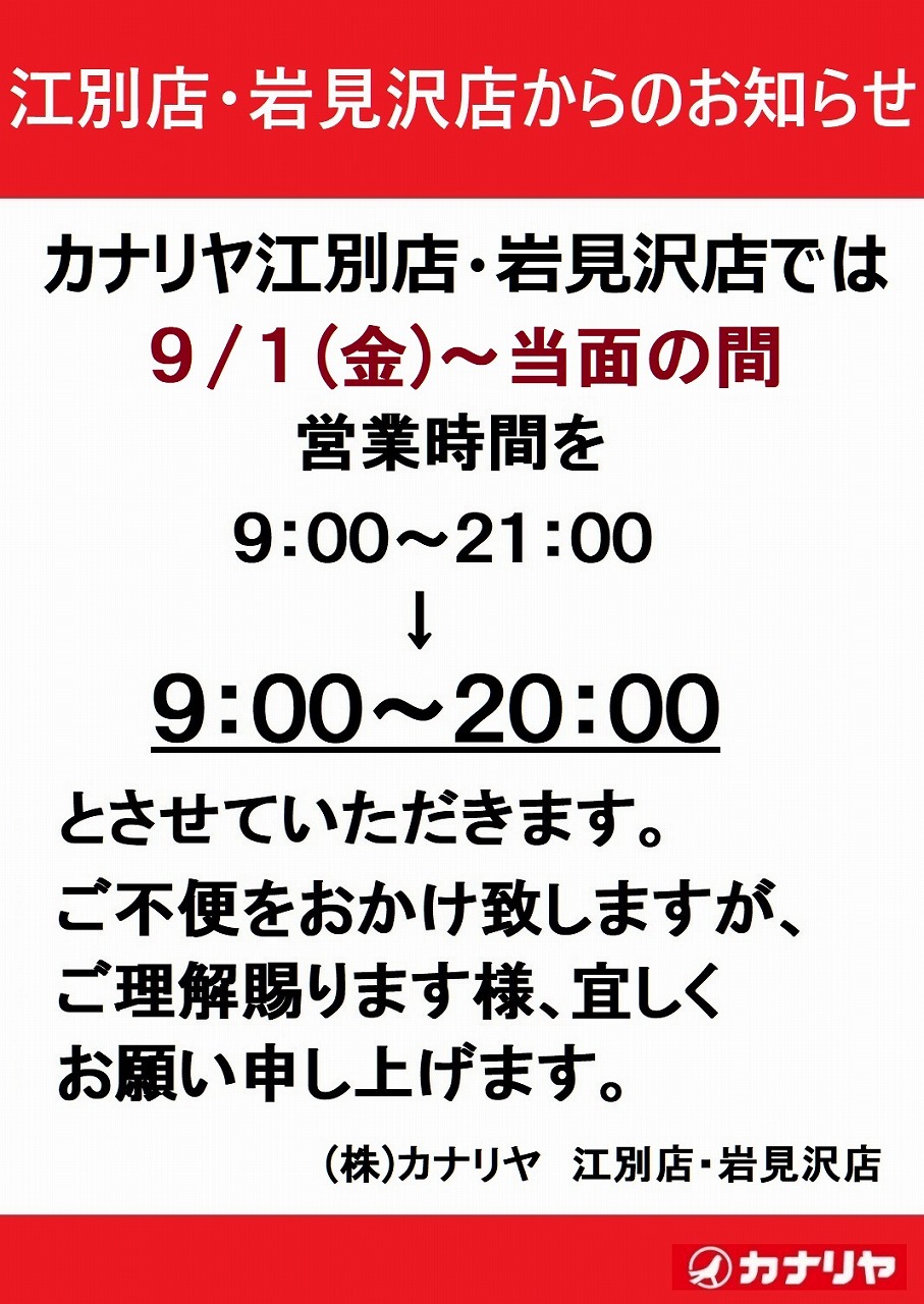 江別店・岩見沢店から営業時間短縮のお知らせです 9/1(金)~当面の間