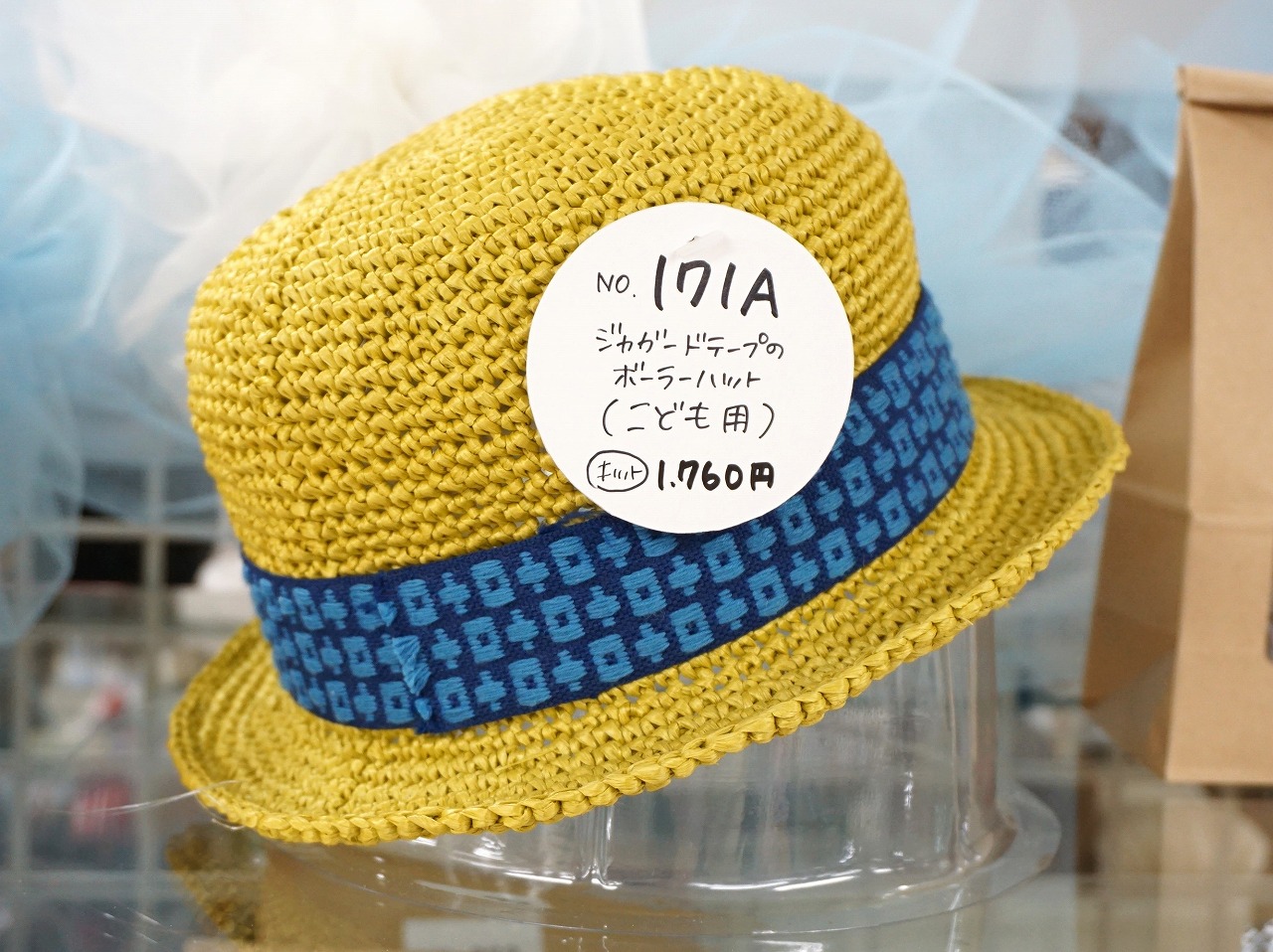そして見本③の巾着はホワイト×水色の千鳥格子が爽やかであり、真ん中のぺたんこバッグは幾何学模様でどこかアジアンテイストな夏らしいデザイン、そして右側の見本ストールは適度に透かしが入ったデザインなので涼し気です♪大人用ハットもジャガードテープが効いてインパクトがあります。