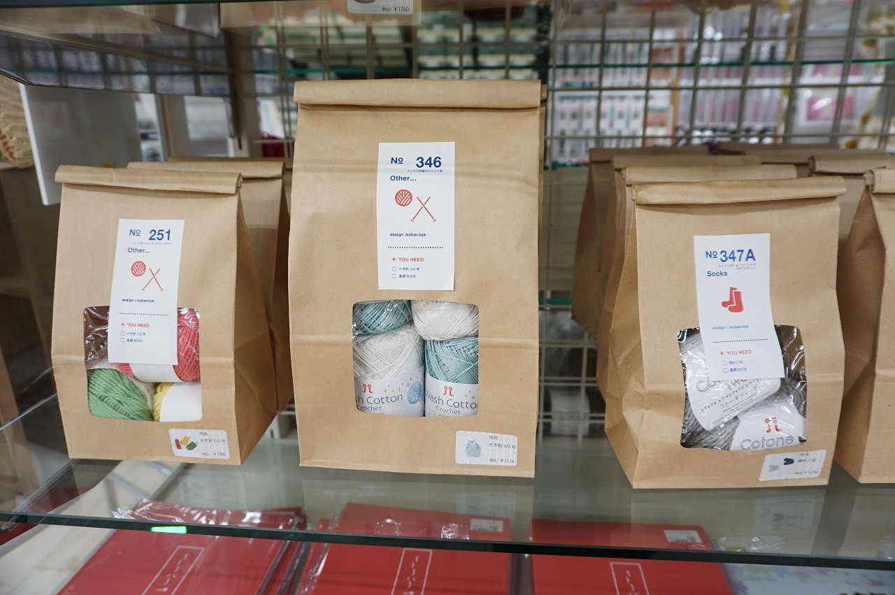 ほぼ袋パッケージで販売されていまして、靴下やストール、帽子、巾着やバッグ等のアイテムをお作りいただけます。箱パッケージのものはクッションや大き目のバッグ等をお作りいただけます。それぞれ別売りでかぎ針or棒針や、中には基礎本(ビギナーズブック)が必要ですが、同フロアで取り扱っていますのでご安心ください。