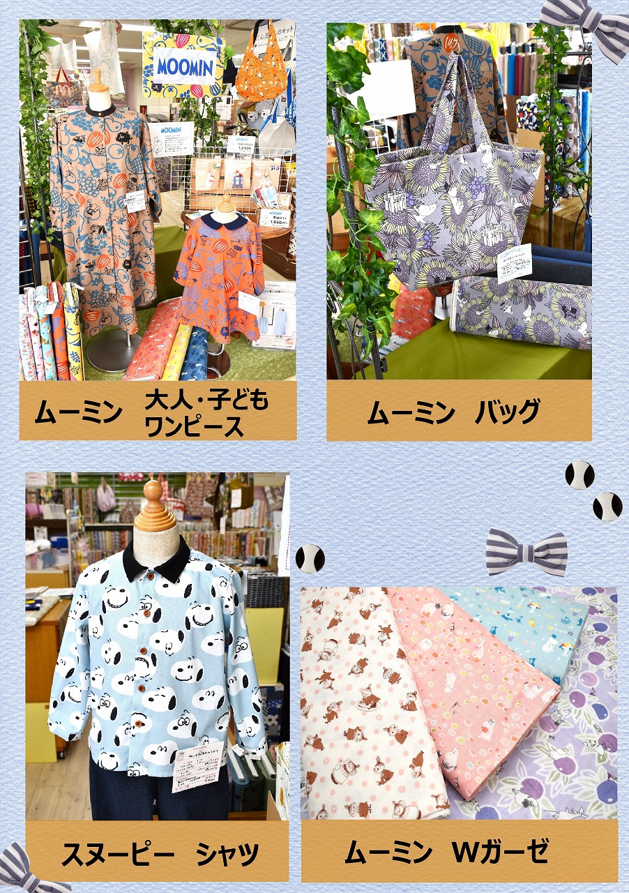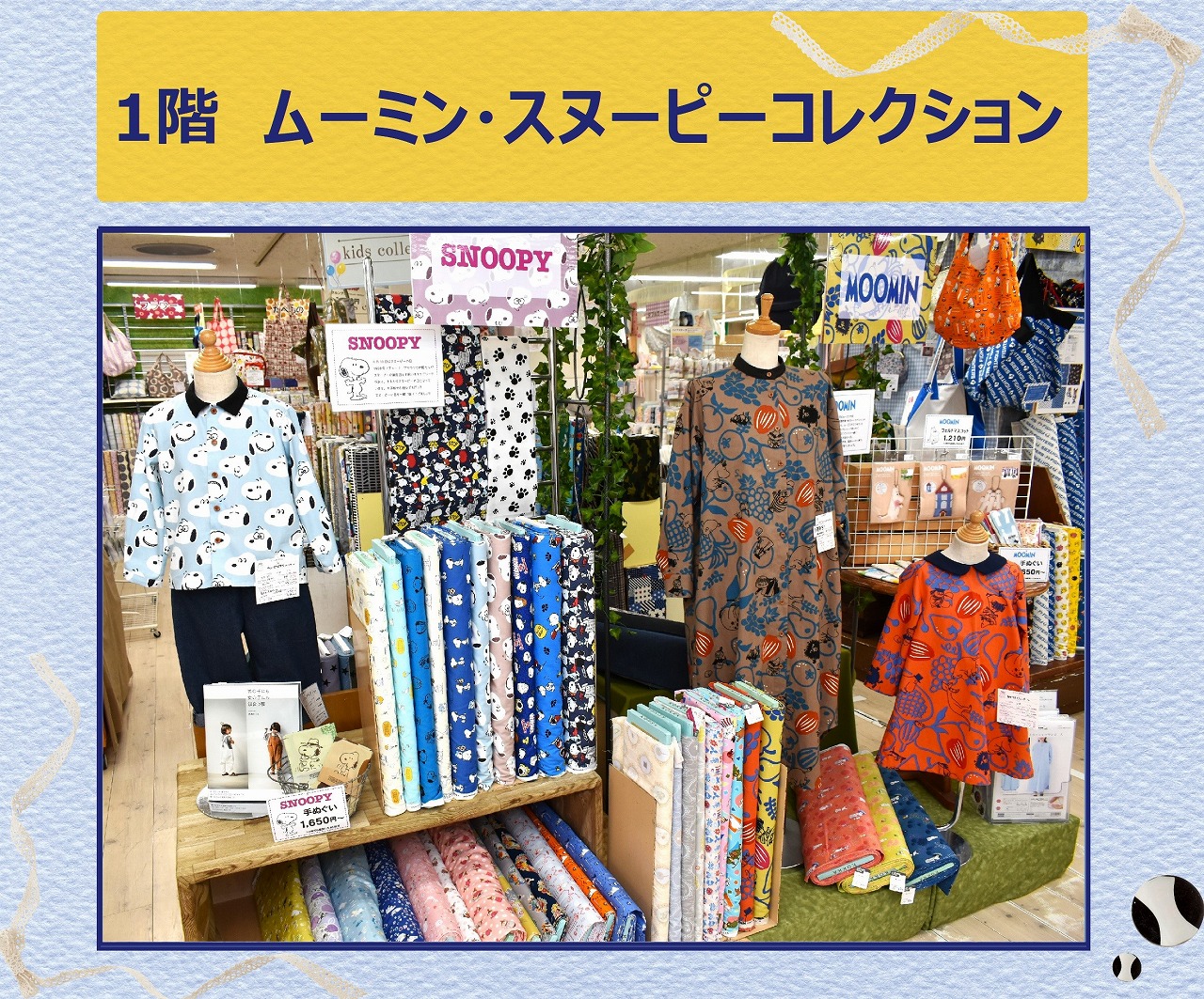 1階よりキャラクター「ムーミン」・「スヌーピー」生地を使用した秋にぴったりな生地が豊富です!!