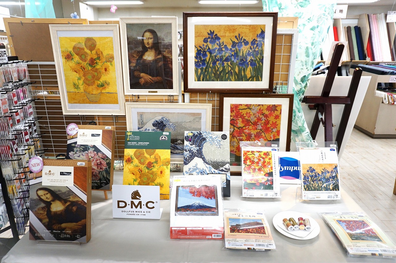 コーナーだけで見ると一種の絵画展をやっているように見えますが、見本作品は全て刺繍・クロスステッチで、キット購入後に作ることが出来ます!!