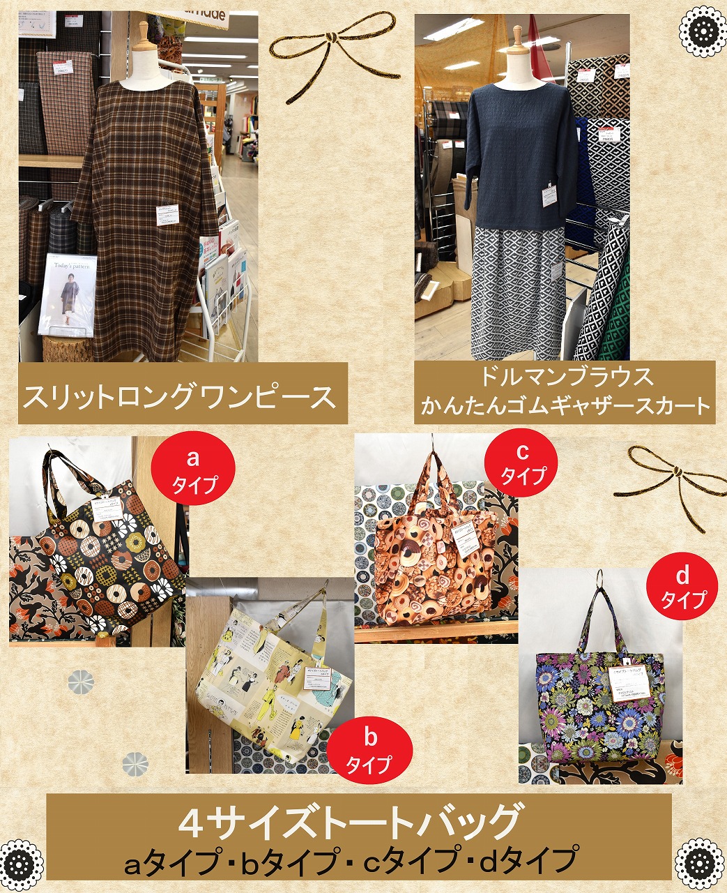 ナイロンやラミネートのバッグ、ウールのワンピースなど、はじめてさんでもチャレンジしやすい形の見本、パターンをご用意しております。