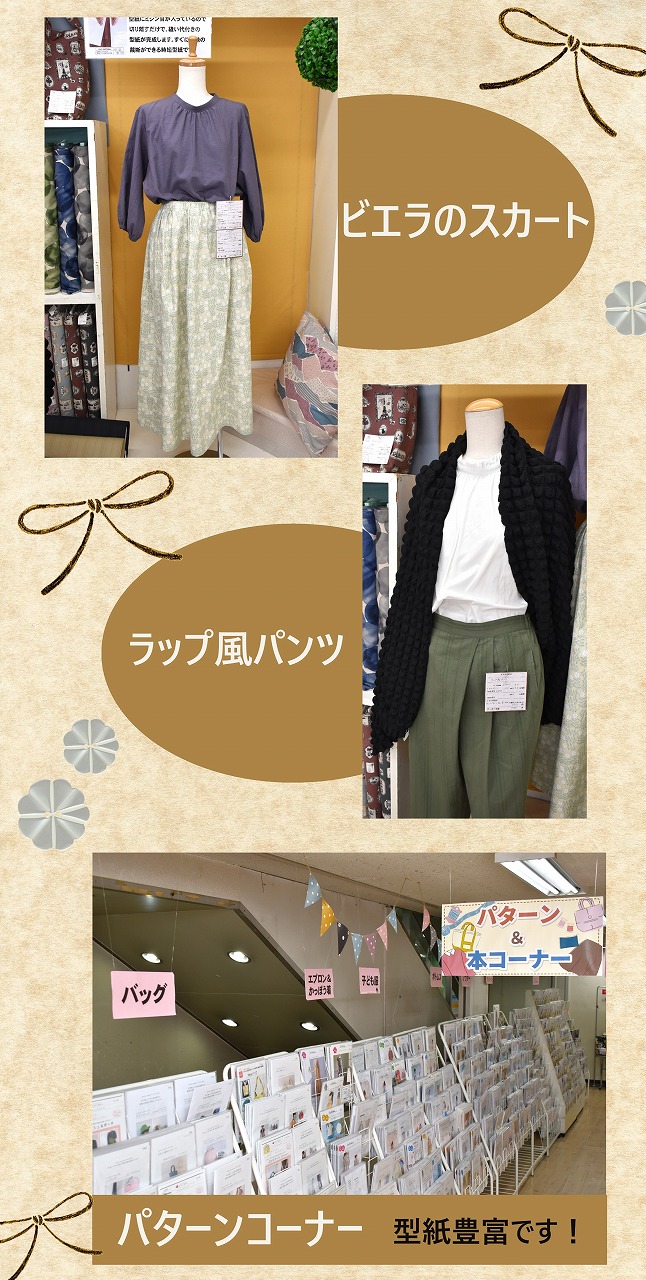 たくさん扱っている型紙の特徴の紹介と、秋にヘビロテできる、服を展示しております。ぜひ、この秋は手芸で服作りにチャレンジしてみませんか??