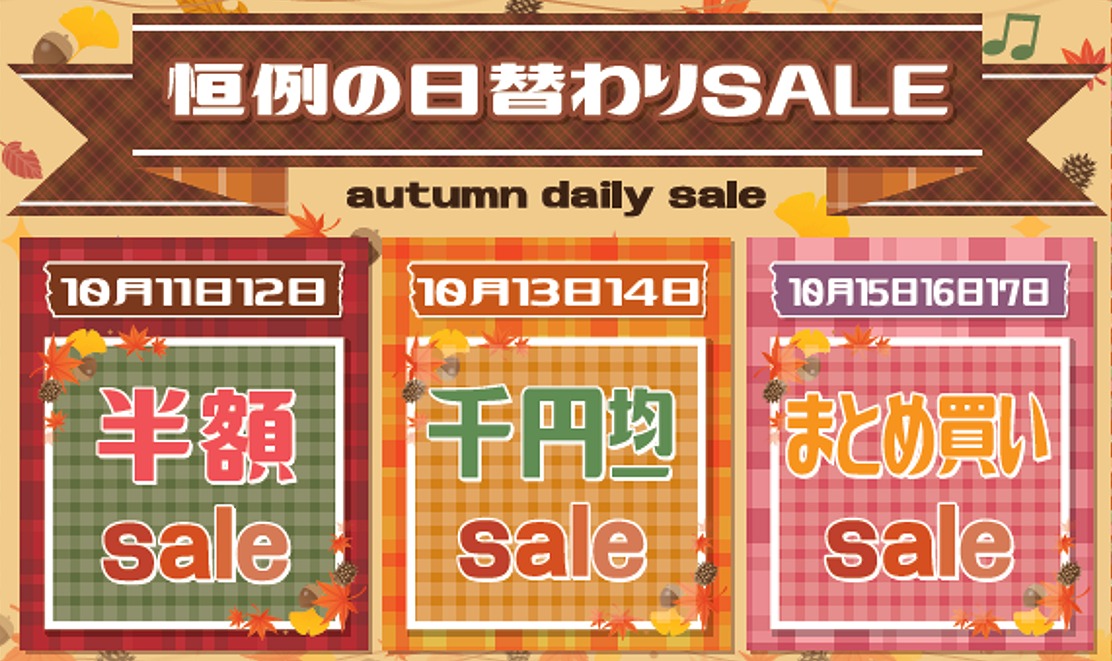 | 10月11日(水)12日(木)は「半額sale」50%OFFの2日間 10月13日(金)14日(土)は「千円均一sale」 1000円で買える嬉しい2日間 10月15日(日)~17日(火)は「まとめ買いsale」 お得にまとめ買いできる3日間 |