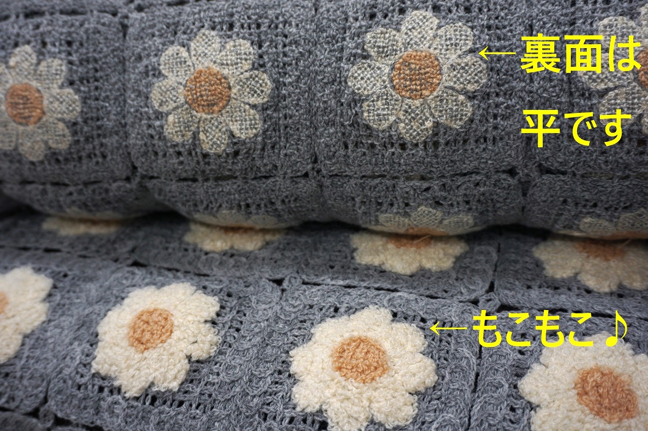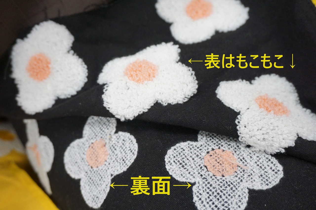 フラットなコットンキャンバス地にもこもこの可愛いお花が立体感を出しています。この立体感を出しているお花は「タフティング風刺しゅう」と言われるもので、タフティングガンと呼ばれる機械を使用し、ラグ・小物に刺繍が施されています。こちらも「モコモコシリーズ」同様、表面はモコモコと立体的、裏は刺しゅうしたような平らな見た目です。