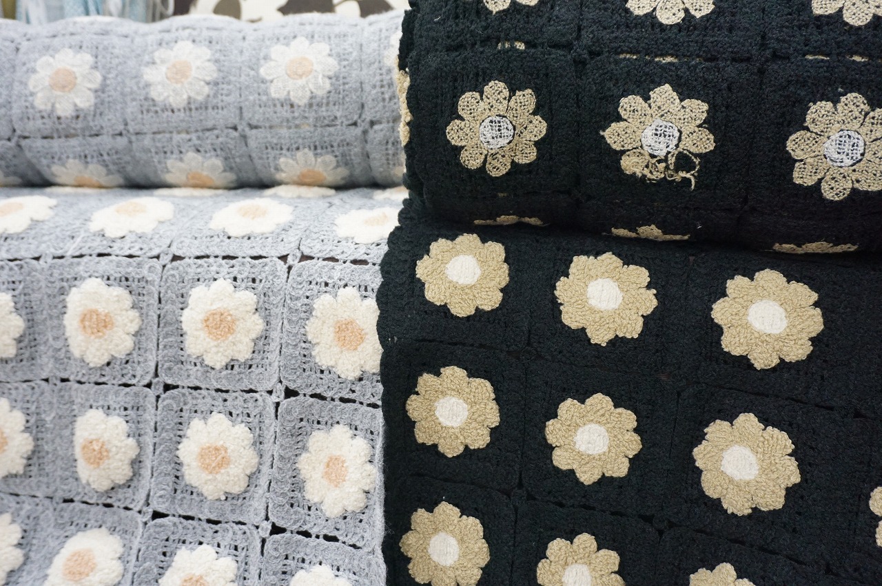 既にフラワーのモチーフに編んでいる、ビックリなアイテム「フラワーパッチニット」が入荷しました!!ご自分で編めなくてもこの生地を使う事で、可愛くてオシャレなハンドメイド作品が出来ちゃいます♪