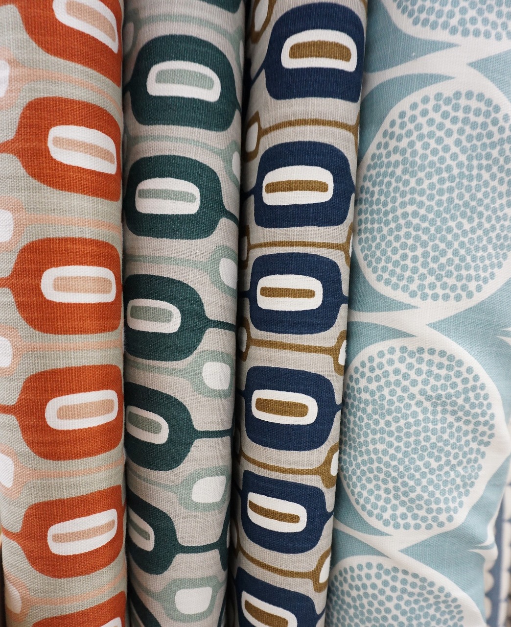 インテリアプリントを使用したクッション見本と、Spira OF SWEDEN生地を使用したランチョンマット・コースター見本になります。