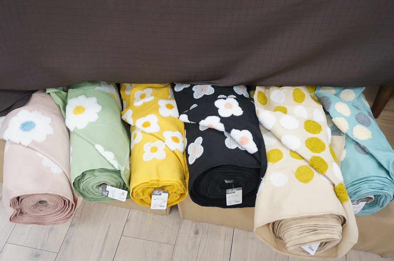 カナリヤ本店1階では秋冬に使いたくなるくすみカラー系の生地やシックで柄が大人っぽいものなどインテリアやエプロンなどにぴったりの生地が豊富です。