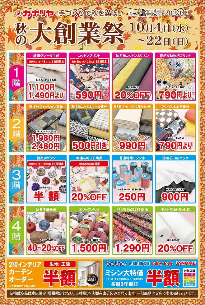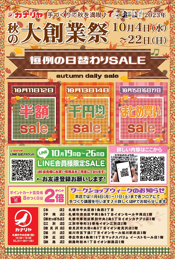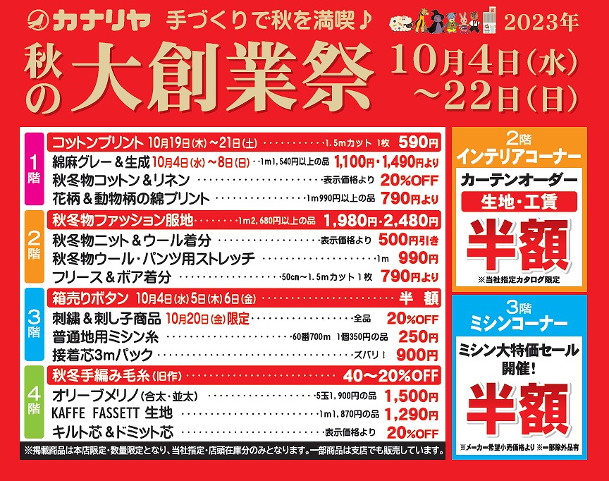 2023年10月4日(水)~22日(日)迄の期間、カナリヤでは「秋の大創業祭」を開催致します。2023年も手づくりで秋を満喫♪ (終了致しました)