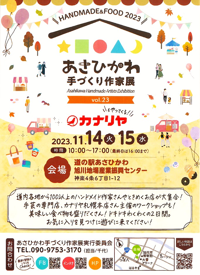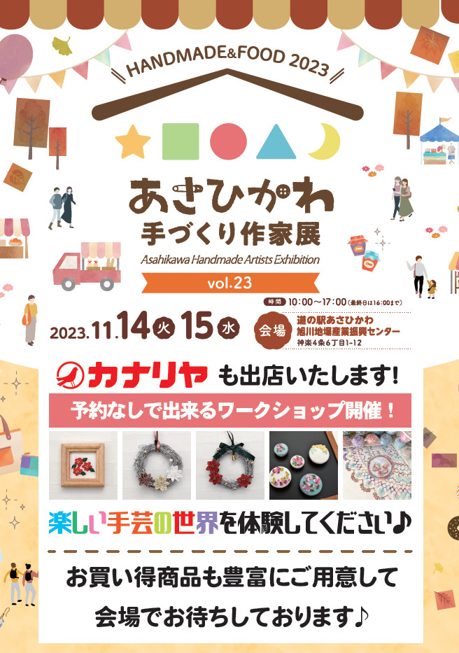 2023年11月14日(火)・15日(水)の2日間、道の駅あさひかわ地場産業振興センター内において「あさひかわ手づくり作家展」を開催致します。こちらのイベントにカナリヤからも参加させて頂きます!! (終了致しました)
