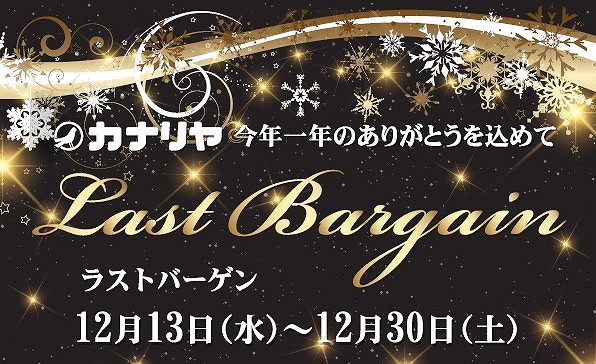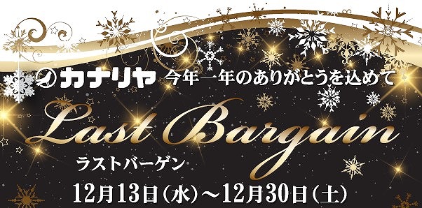 2023年12月13日(水)~12月30日(土)までの期間、カナリヤ全店にて、今年一年のありがとうを込めて「ラストバーゲン」を開催致します。(終了致しました)