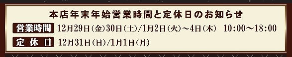 営業時間:12月29日(金)30日(土)/1月2日(火)~4日(木)10:00~18:00