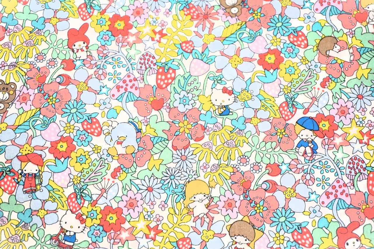 キティちゃんやキキララ等のおなじみのキャラクターがリバティプリントの世界に入り込んだ可愛い生地が揃っています。
