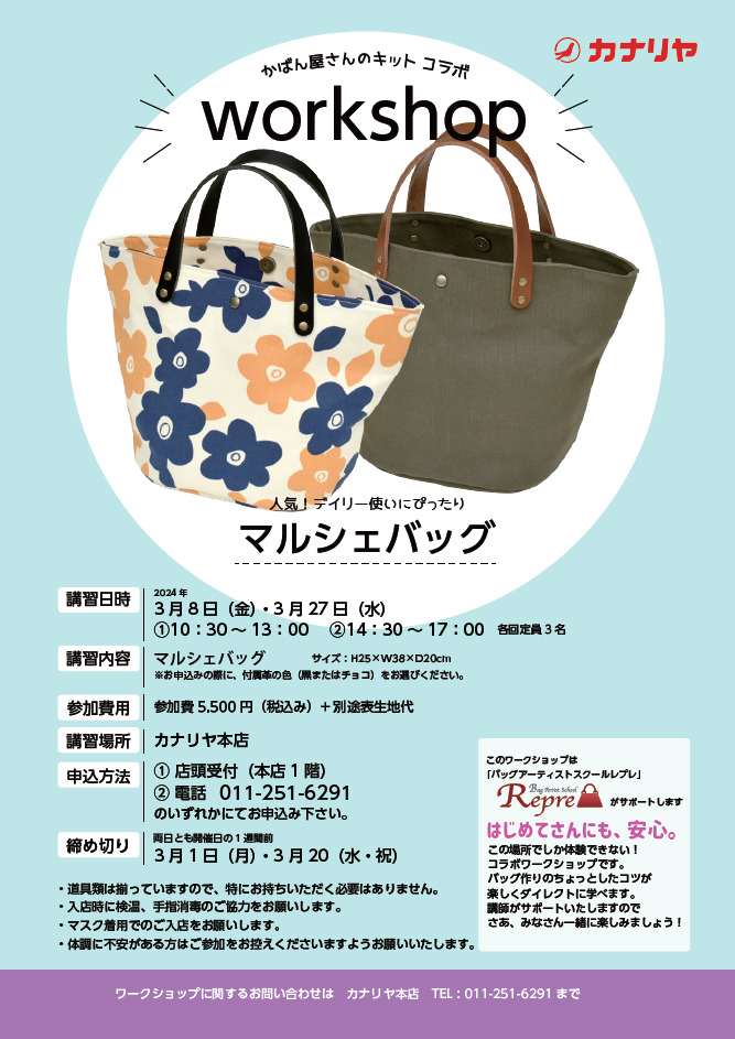 2024年3月8日(金)・3月27日(水)、カナリヤ本店1階にて特別ワンデイレッスン「マルシェバッグ」を開催致します。(終了致しました)