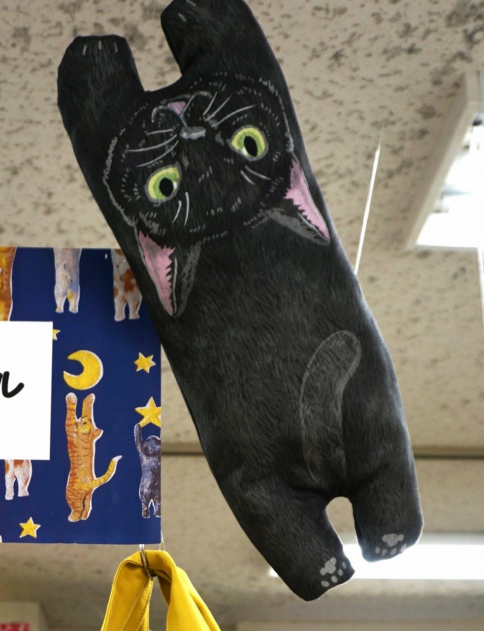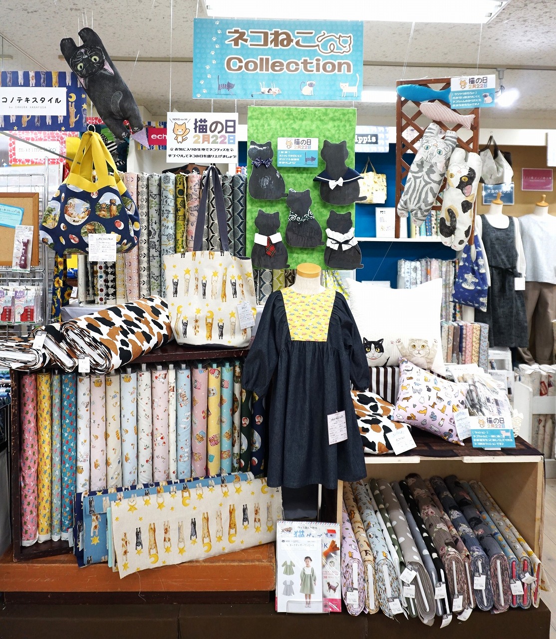 ネコに関する生地やネコ生地を使用した見本、一部おもちゃや提案アイテム等が展示中!