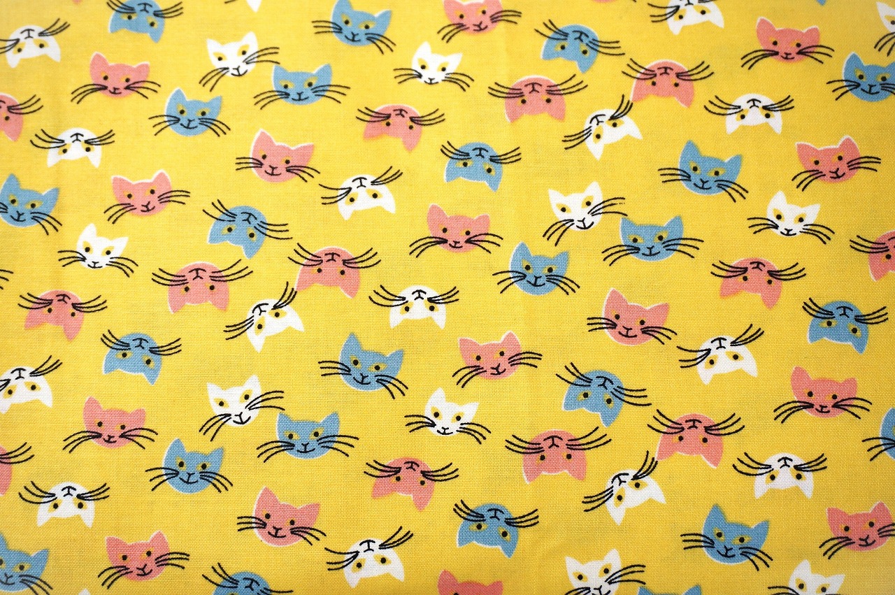 使用している生地も白・ピンク・ブルーの猫の顔が散りばめられ、どの猫も笑顔なので見るだけで笑顔になる柄です!入園入学や小物、インテリアなどにもおすすめです。