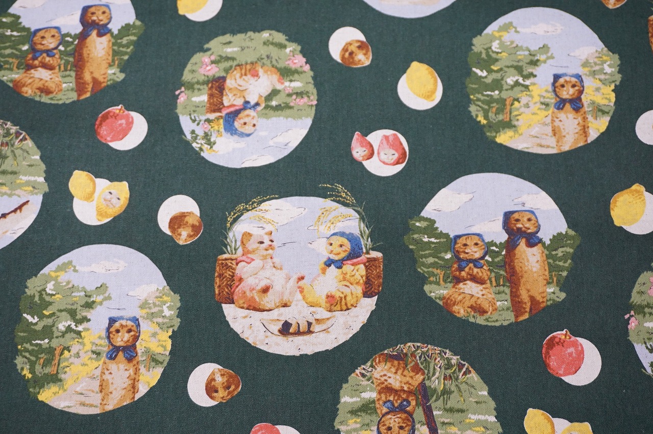 ネコちゃんの行動シーンが描かれた、デザイナーコラボの生地です。ネコのほっかむり姿や時々いちごやレモン等の中から可愛らしい顔をのぞかせている姿が面白いです♪