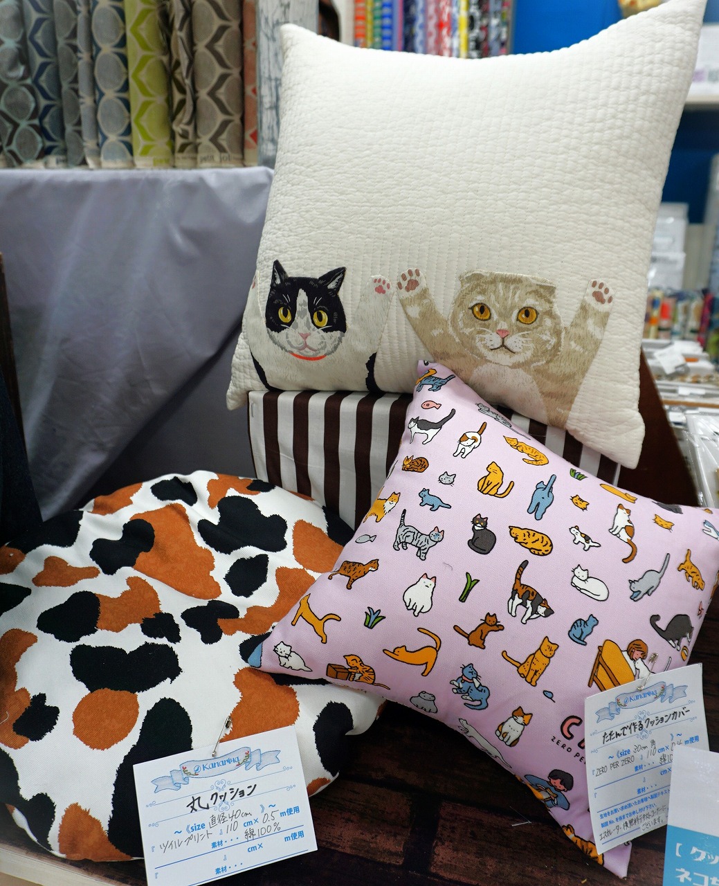 見本のプリントもミケネコ模様や、韓国デザイナーデザインの「ZERO PER ZERO」を使用したり、ネコをプリントしたクッション等、ネコを身近に感じる柄を選んでみては?