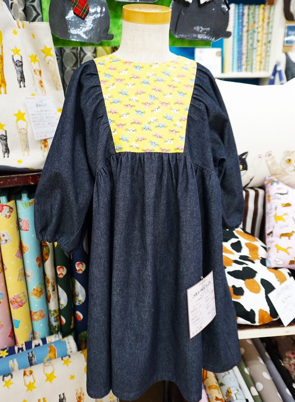 子供ワンピースの見本です。ヨーク部分に猫柄を使用しています。